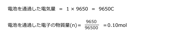 まず、電池を通過した電子の物質量を求めます。1Aで9650秒間流したわけですから